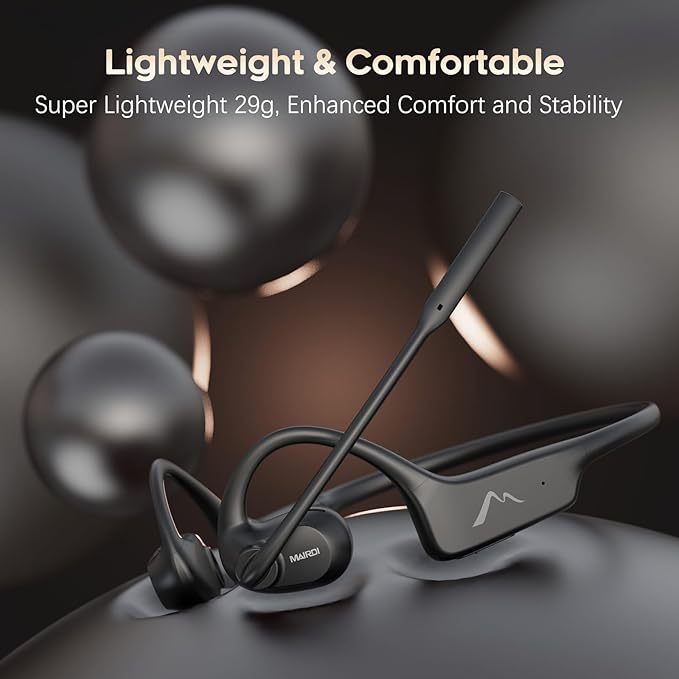 - Lightweight, Ergonomic, and Comfortable: weighing just 28 grams, the MAIRDI Bluetooth headphone provides all-day comfort with its lightweight, ergonomic design. The soft, skin-friendly silicone ear pads make it easy to wear for extended periods, even with helmets or glasses. Its secure fit ensures the open ear headset stays in place during activities, and when not in use, you can conveniently hang it around your neck.