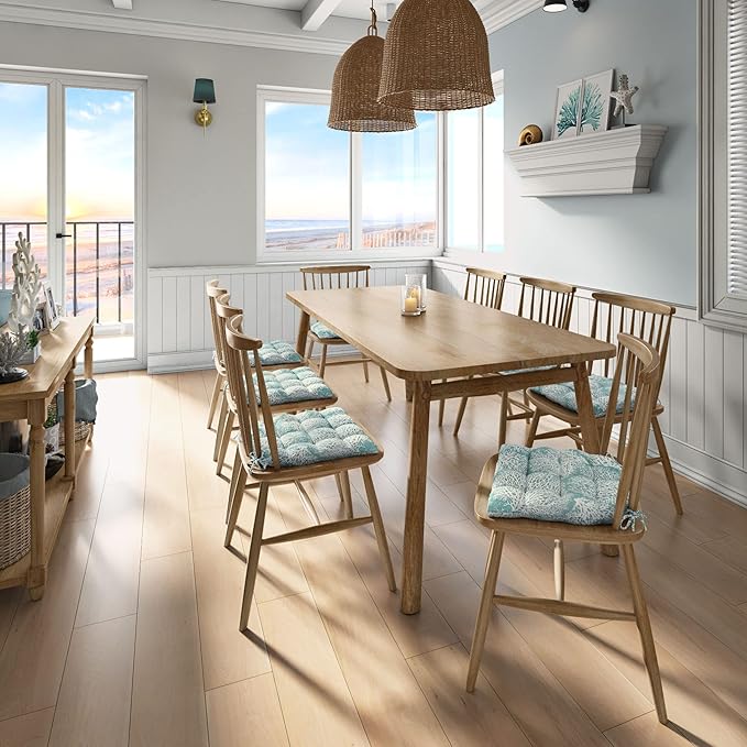 - Machine Washable Indoor Chair Cushions: These kitchen chair pads are machine washable for easy cleaning and maintenance; kitchen seat cushions are reversible to the same Ariel Fan Coral Design