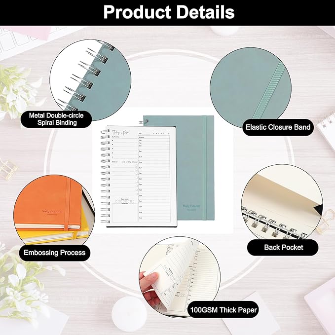 - Advantage: The cover of the daily planner is made of imitation leather, with a realistic texture, stylish and elegant. Easy to clean and maintain, strong wear resistance, can maintain long-term beauty. An elastic band design can be securely closed to protect the contents. There is a pocket on the back for notes, receipts and cards. Double-wire binding can smoothly turn pages for easy use. 100gsm non-bleeding paper, ensure that your notes remain neat and clear when using most pens.