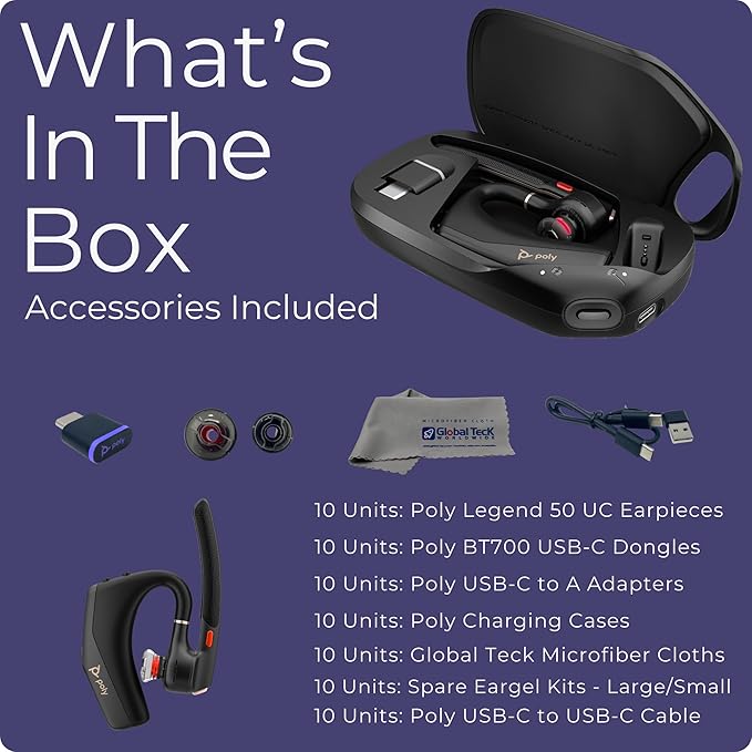 - Global Teck bundle: 10 units Poly voyager legend 50 bluetooth headset; 10 Global Teck Worldwide microfiber cloth