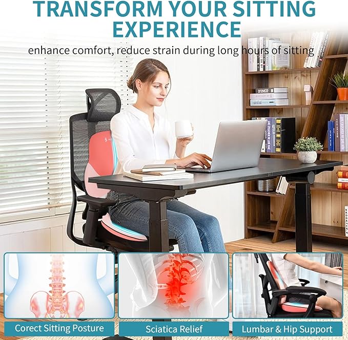 - Pressure Relief for Enhanced Comfort: Enjoy all-day comfort with our ergonomic seat cushions and lumbar support pillows, designed to reduce discomfort in the lower back, tailbone, and sciatic nerve. Promote a healthier sitting posture and make long hours of sitting more enjoyable.