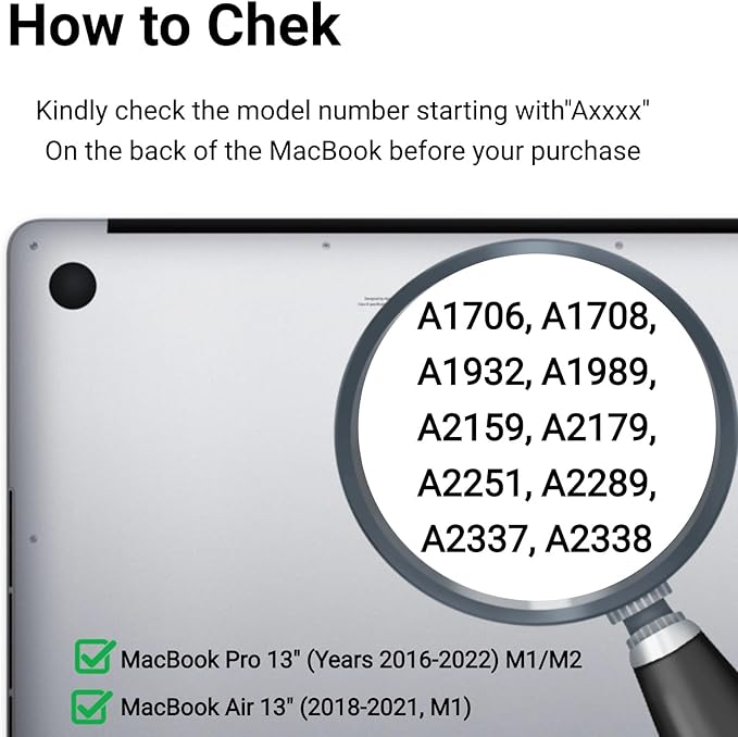 - Compatible Phone Models : MacBook Pro 13 inch (2016-2022, M1, M2), MacBook Air 13 inch (2018-2021, M1) - Models: A1706, A1708, A1932, A1989, A2159, A2179, A2251, A2289, A2337, A2338 MacBook Pro 13 inch (2016-2022, M1, M2), MacBook Air 13 inch (2018-2021, M1) - Models: A1706, A1708, A1932, A1989, A2159, A2179, A2… See more