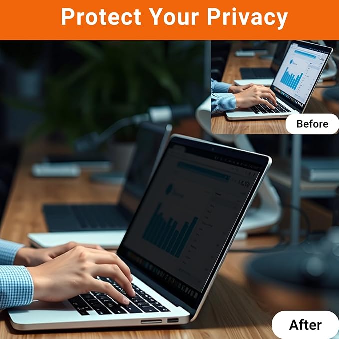 - Privacy Without Compromise and Productivity Without Limits: The laptop screen privacy shield safeguards sensitive data in public settings like offices, classrooms, airports, and open workspaces, offering precise fit and full coverage for professionals, students, and travelers on-the-go