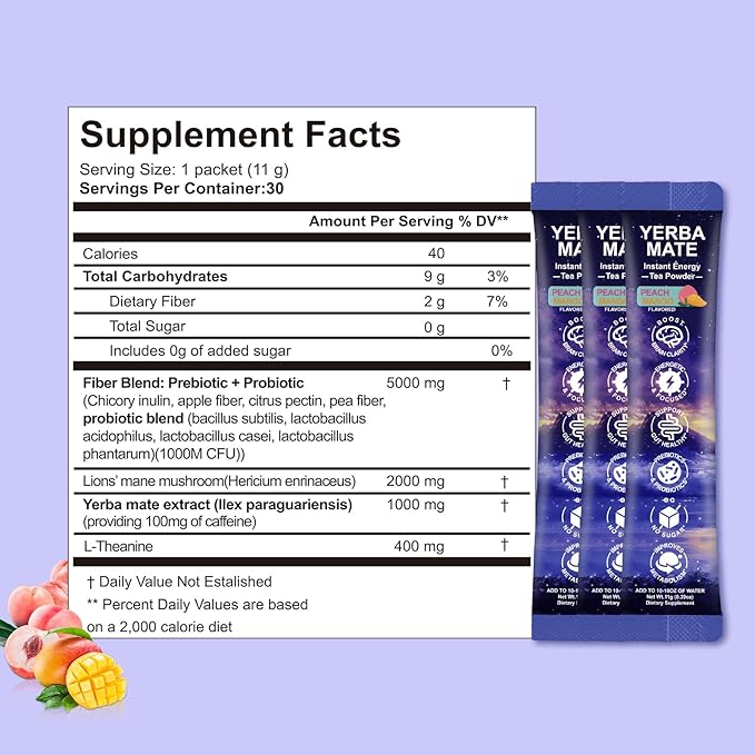 - Pure and Natural: Each serving contains 1000mg of Yerba Mate Tea Extract with Prebiotics and Prebiotic Fiber to enhance mental acuity and intestinal flora balance at the same time
