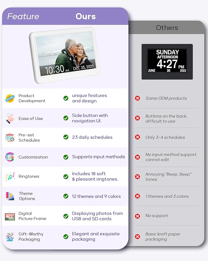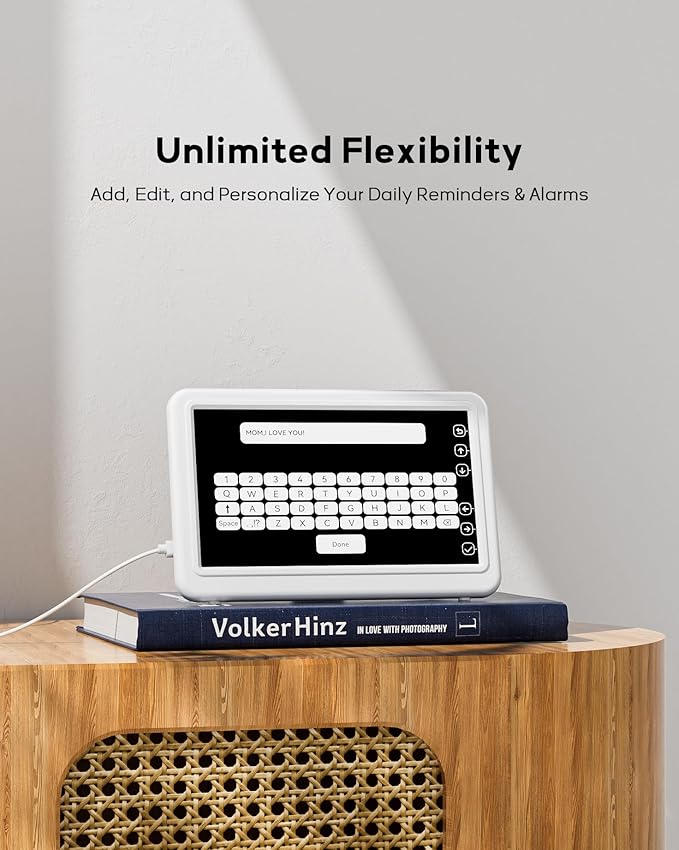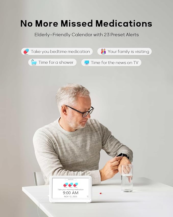 - ๐๐ ๐๐ฎ๐ข๐ฅ๐ญ-๐ข๐ง ๐๐๐ก๐๐๐ฎ๐ฅ๐๐ฌ: Pre-set reminders for medication, activities, showers, visits, and more. Perfect for daily organization, especially for seniors. Plus, customize with your own schedules and greetings.