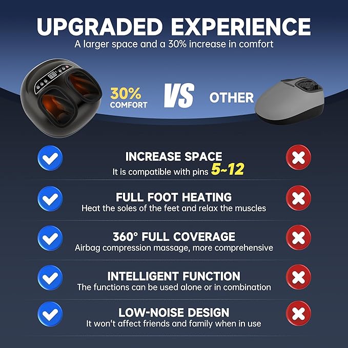 - New upgrade Foot massager with coverage air compression technology further enhances the relaxation, P1-P5 customize modes allowing you to indulge in deep kneading and squeezing sensations. After a long, bustling day, this foot massager provides the perfect remedy, helping you fully unwind and effectively relieving tired muscles. It’s your personal relaxation station, bringing you comfort and rejuvenation at home.