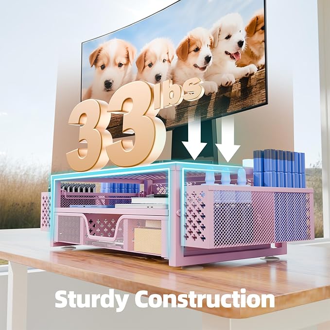 Simple Trending 2 Tier Metal Monitor Stand Monitor riser and Computer Desk Organizer with Drawer and Pen Holder for Laptop, Computer, iMac, Pink