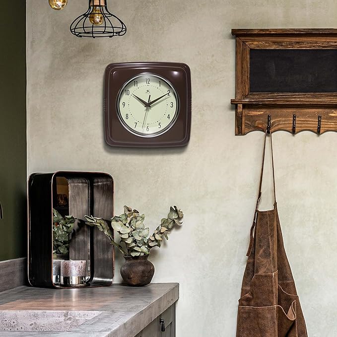 Infinity Instruments Square Retro Wall Clock, Mahogany, 9.25"
