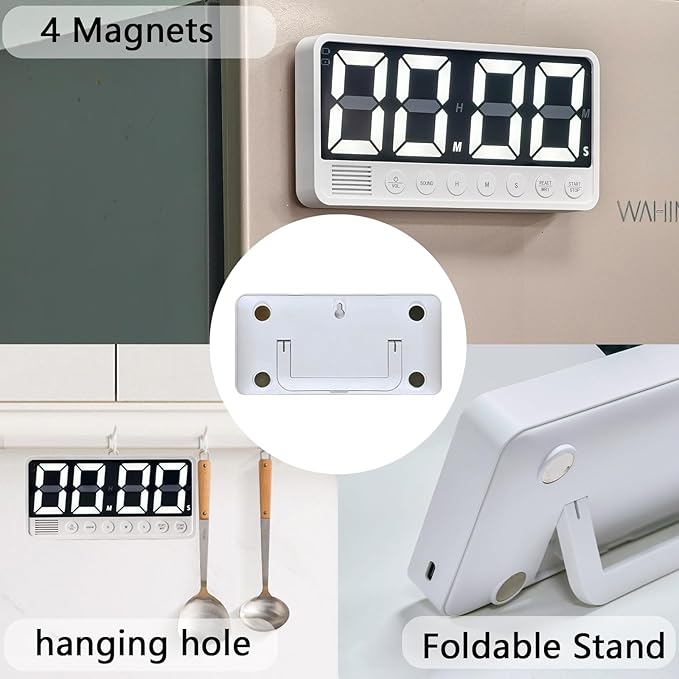 - Place The Timer Wherever You Need: The digital kitchen timer for cooking with 4 strong built-in magnets for a powerful suction and no slip, easily to stick it on any metal surface directly, or you could hang it anywhere by using the hook, it also comes with a stand for place on desktop. Ideal for kids, seniors, housewives, cooking, homework, yoga, skin care, meeting, exercise, sports, home gym, classroom, office, library, lab