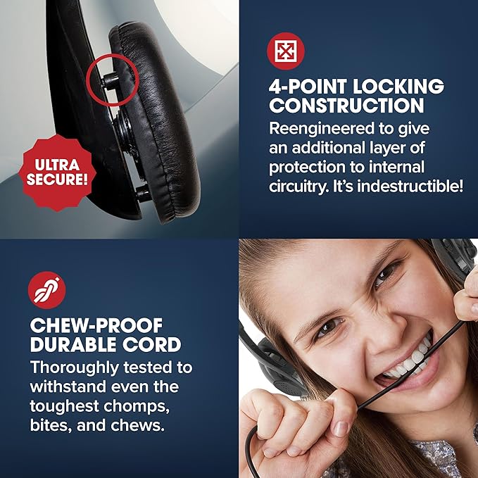 - Rugged and Durable Design: Our School Headphones are built different than our competitors. These headphones are meant to last! With a rugged tough design they can take a beating. With reinforced welds and a band that is fully twistable so this construction is meant to last. The 6 foot braided fabric cord is strong enough to lift up to 40 pounds or be dropped from 20 feet and sound just like new!
