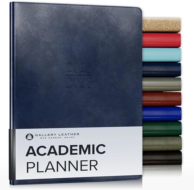 Gallery Leather Academic Planner 2025-2026, Teacher and Student Weekly Monthly Planner, Elegantly Bound Calendar with Gold-Gilded Page Edges, 18 Months - Acadia Navy - 9x7"