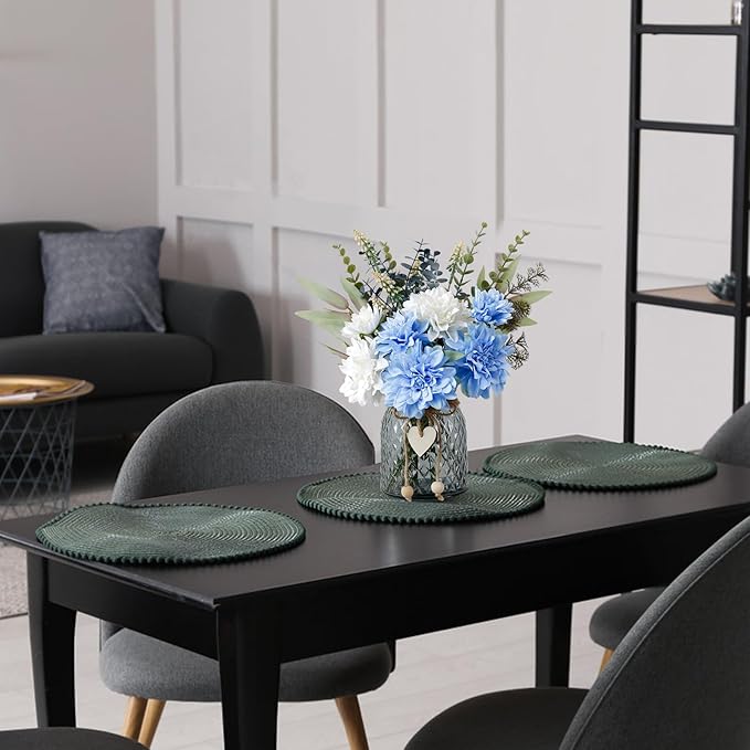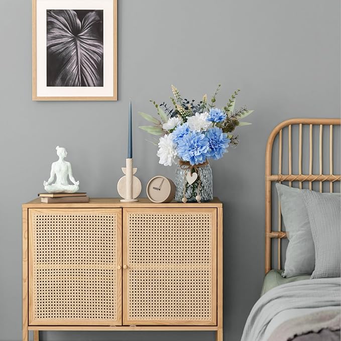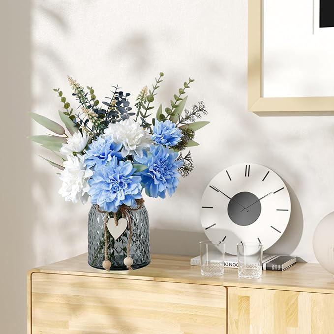 - LEFTOVER's Fake Flowers in Vase:Artificial Silk dahlia Bouquet in Vase include 7 dahlia heads,eucalyptus stems and some fake plants and a glass vase with a heart, ball pendant and twine,perfect for coffee table centerpiece and dining table centerpiece decor