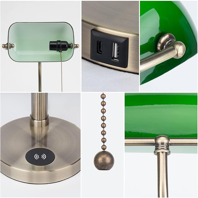 - 【Wireless Charging & USB Port】The wireless charging pad at the base of this banker desk lamp and the USB port can charge your mobile phone and other small electronic devices. It has a good charging function and avoids tangled charging cables, saving a lot of space.Charging function works whether this green bankers lamp is on or off.
