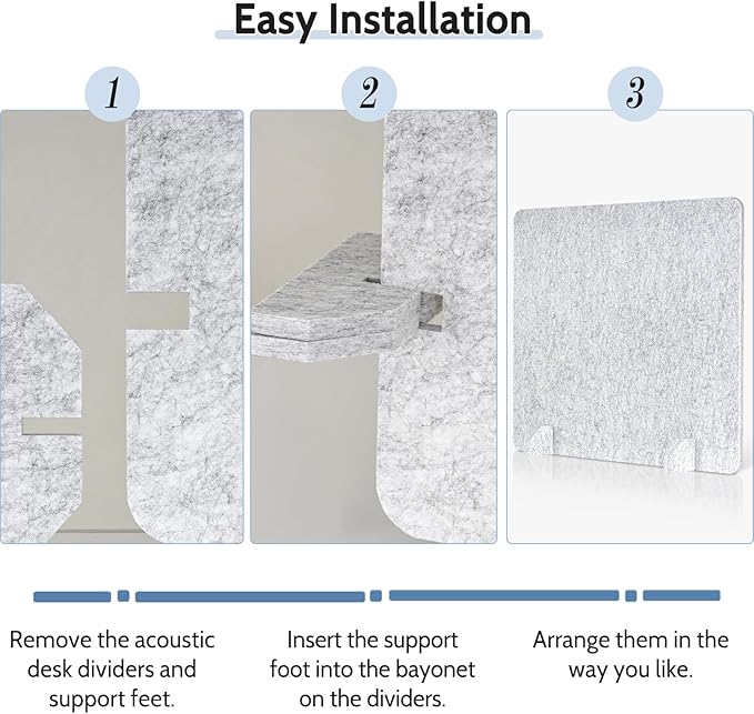 - 【Easy Installation】- Set up your acoustic desk dividers easily. First, take out the dividers and support feet. Then, insert the feet into the slot on the dividers. Finally, arrange the soundproof room dividers as you like to fit your workspace. You can set them up in minutes, saving you time and energy