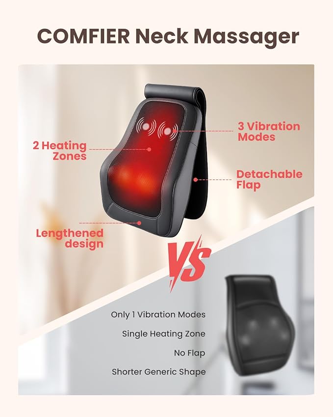 - 【Ergonomic Design and Removable Flap】Comfier back neck massager for pain relief perfectly fits the neck and back curves to provide the most comfortable massage experience. Most uniquely, Comfier electric back massager are equipped with detachable flaps that can make massage more comfortable. Also, the flap prevents massager from dust accumulation,making it easy to clean and convenient to store when not use.