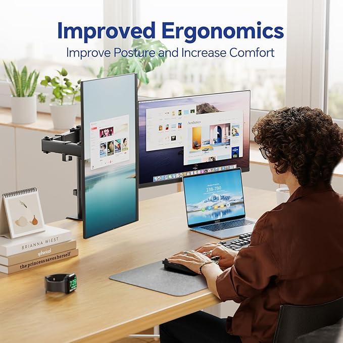 - Free Up Desk Space: The monitor desk mount elevates the monitor to the desired height, freeing up valuable desk space for laptops, keyboards, or other devices. It comes with clamps for neat cable management.
