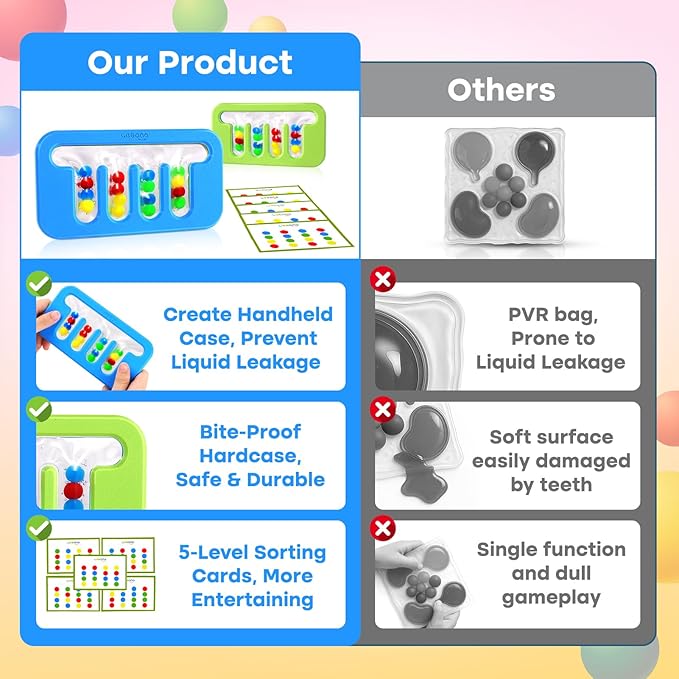 - Novelty Color Sorting Toys - Classic Handheld Color Sorting Toys, blue-green double-sided, come with 5-level challenge cards that classify colors by squeezing and pressing different colored rubber beads and placing them into the correct path to complete the color matching. Improves fine motor skills, hand-eye coordination, and logical thinking. A fun and safe way to spark early brain development while keeping kids engaged and focused, perfect for toddlers 3 4 5 years preschool, home learning