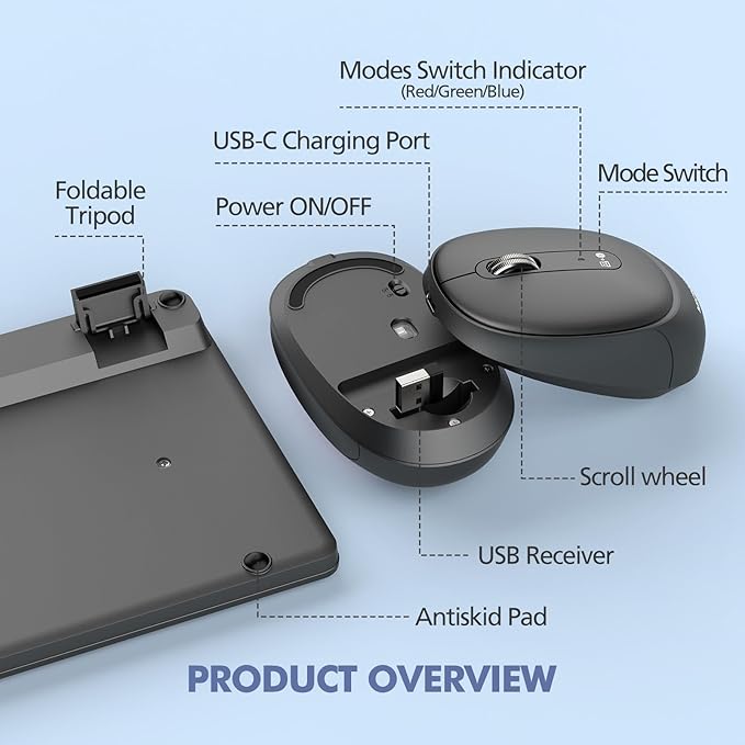 - 【Bluetooth Wireless Keyboard and Mouse Combo】Connect up to 3 devices via 2.4GHz and Bluetooth 3.0/5.0, and switch between them using Fn + the mode switch key.
