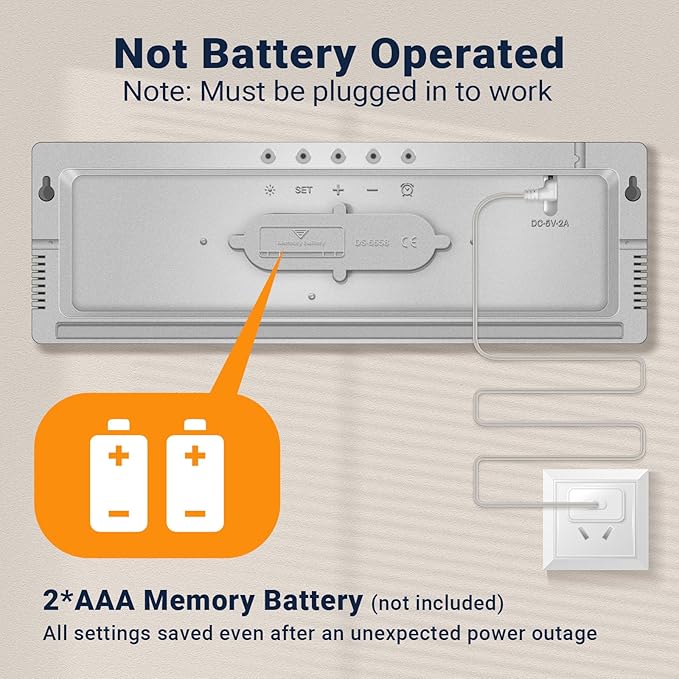 - Have to Plug-in: This is a plug-in wall clock. Not battery operated. Memory batteries (not included) only maintain memory function during power outages