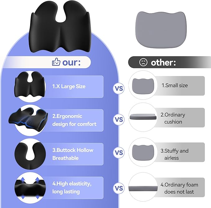 - 【Versatile & Adaptable Design】Our tailbone pain relief cushion is suitable for use in office chairs, cars, sofas, game chairs, outdoor patio cushions, and even in travel and sports venues. Experience unparalleled comfort, whenever and wherever you need it!