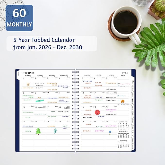 - 2026-2030 MONTHLY PLANNER: This planner 2026-2030 features 60 monthly planning from January 2026 to December 2030. Size: 6.2'' x 8.4'' with ruled spread offers ample writing space and easy to carry. Great 5 year planner to organize your every month and every day.