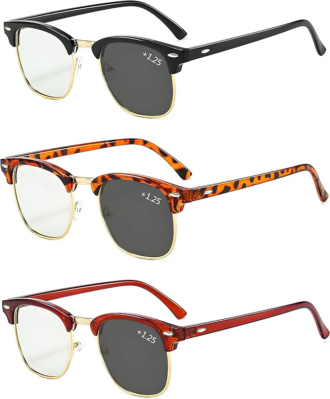 Half frame Retro Semi Rimless Photochromic Lens Glasses Blue Blocking Eyewear For Men Women (3 Pack Reading 1.25 X)
