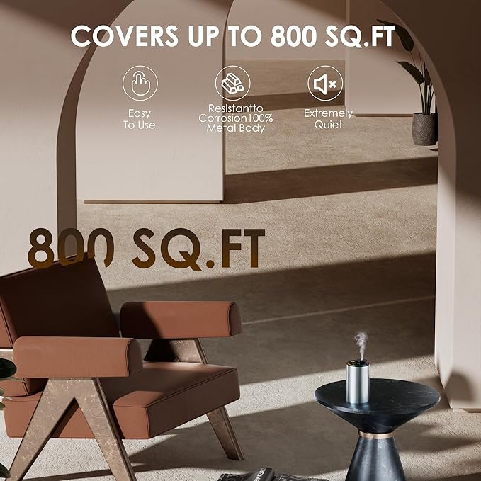 - Wide Coverage & Compact and Efficient: The Diffuser for Essential Oils can cover an area of up to 800 sq. ft and operates efficiently in large spaces. It effectively eliminates and masks unpleasant odors in areas such as pet rooms and bathrooms.
