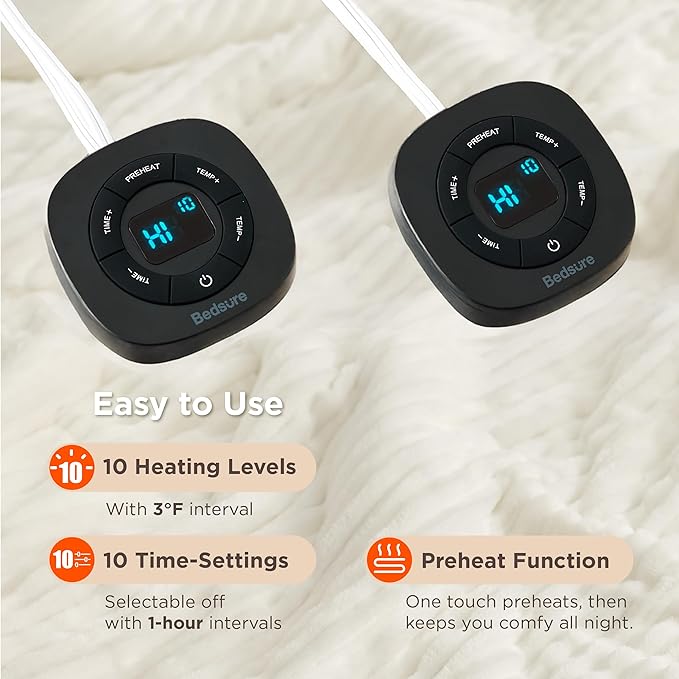 - Customizable Warmth: Featuring fast and consistent heating, this electric blanket offers 10 heating levels and 10 time-settings with preheat function for customizable coziness. Powered by advanced heating wire technology and equipped with dual controllers, it can precisely control temperature, ensuring safer warmth