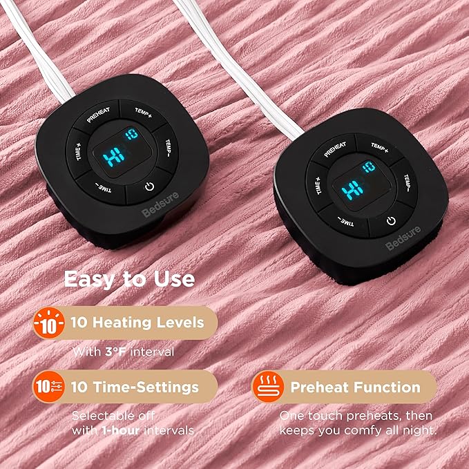 - Easy to Use: This queen size electric blanket with dual control guarantees comfort for thermally incompatible couples. Preheat function conforms to changes in body temperature, keeping you comfortable all night without feeling dry
