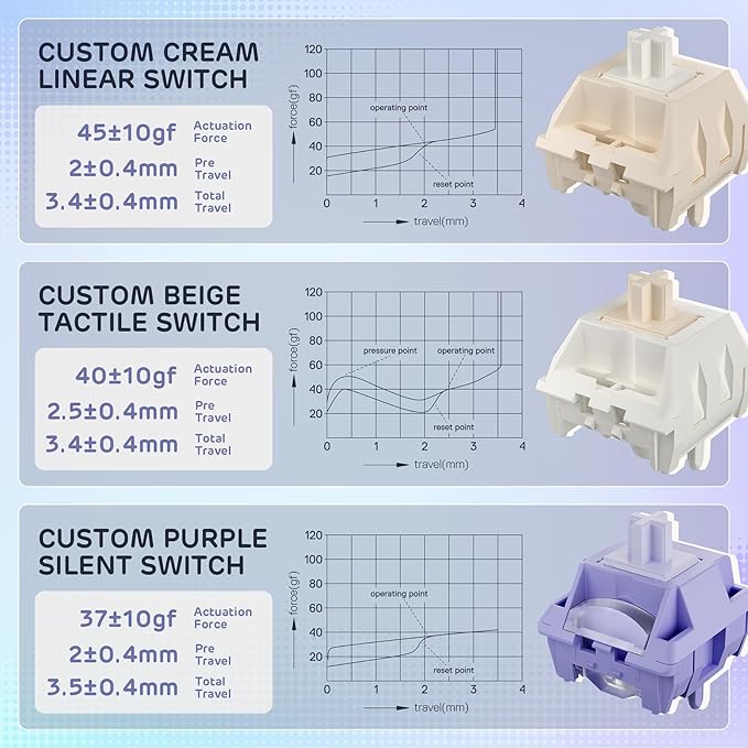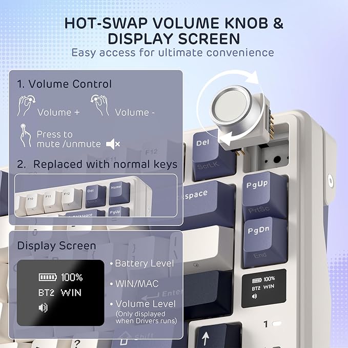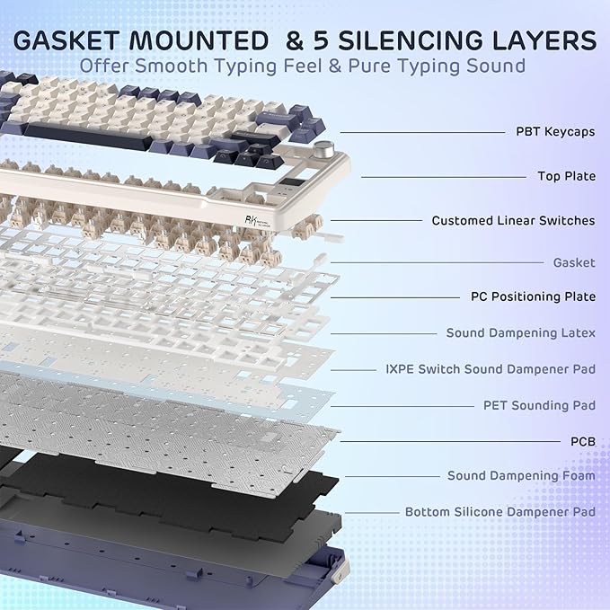 - Five Sound-Dampening Layer — With five layers of internal padding, including 2 layers of thick sound-absorbing foams, an IXPE switch pad, silicone dampener and PET sound-enhancement film, this keyboard structure significantly minimizes hollow sounds and cavity noise, delivering a super smooth and satisfying typing experience.