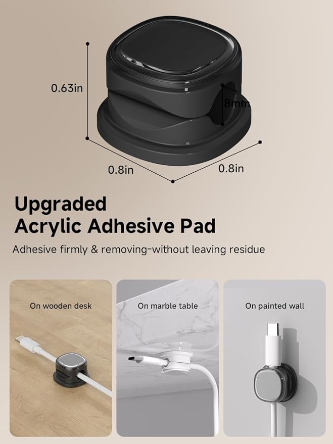 - No-Residue Acrylic Adhesive : Unlike ordinary adhesive tapes, our cable holder organizer utilizes the acrylic adhesive that is stronger and leaves no residue and won't damage your desk / nightstand or walls when removed. Just simply stick the wire holder organizer to any smooth and dry surface, such as wooden table, glass, or ceramic tiles, etc