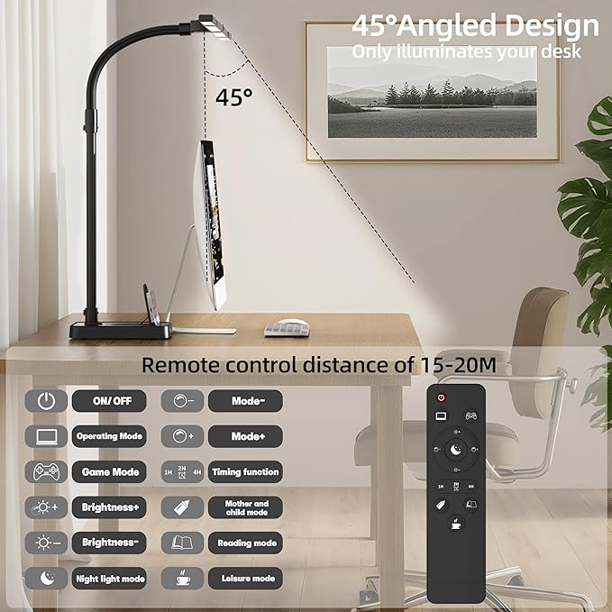 - Multiple lighting modes & memory function: This multi angle desk light for office can easily switch between five color temperatures (3200K-6500K) and five brightness levels (10%-100%), allowing you to flexibly adjust according to your needs, creating the perfect atmosphere for work, study, relaxation, or focused concentration! In addition, the memory function retains your previous lighting settings, enabling direct activation the next time you turn it on, eliminating the need for adjustment and providing peace of mind and convenience. The color temperature and brightness are adjusted in tandem, simulating natural light changes and reducing eye strain