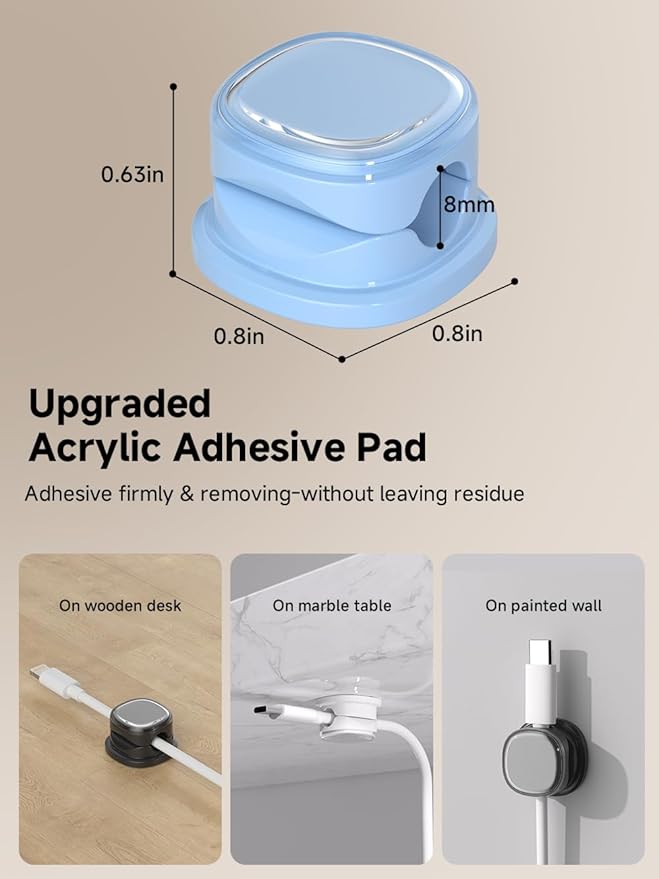- No-Residue Acrylic Adhesive : Unlike ordinary adhesive tapes, our cable holder organizer utilizes the acrylic adhesive that is stronger and leaves no residue and won't damage your desk / nightstand or walls when removed. Just simply stick the wire holder organizer to any smooth and dry surface, such as wooden table, glass, or ceramic tiles, etc