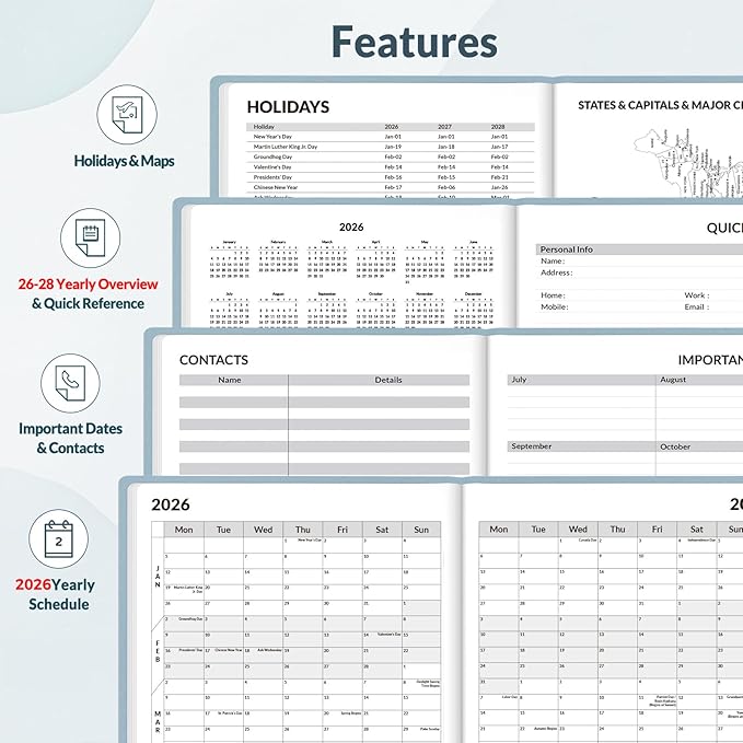 - Additional Features - The weekly planner includes 2026-2028 calendars, holiday lists, contact pages, notes pages, important dates, and US time zone map.