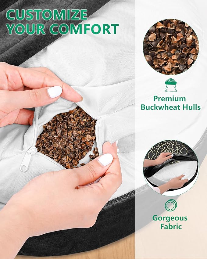 - Luxurious Velvet & Natural Buckwheat Filling: Features a soft, premium velvet cover for a plush feel and elegant look, while the natural buckwheat hull filling provides adjustable firmness and stable support for spine alignment