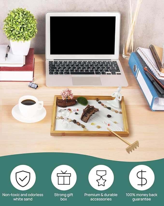 - 🌫️[Relax and play] Our zen garden is a beautifully designed zen decor that's all about bringing the peace of the Zen into your life. Easy-to-set and move sandbox is perfect for anyone who wants to escape from their bussy life for a few minutes.