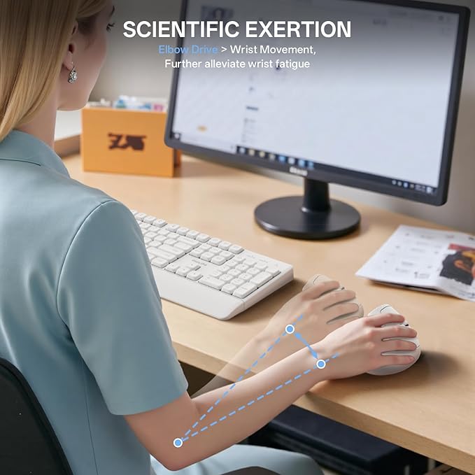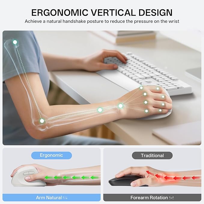 - Vertical design, no wrist fatigue - Say goodbye to the traditional mouse's “slumped” position! This ergonomic vertical mouse naturally fits the palm like a hand grip, allowing the arm and wrist to maintain a relaxed state, long time office, game is not sore and not tired