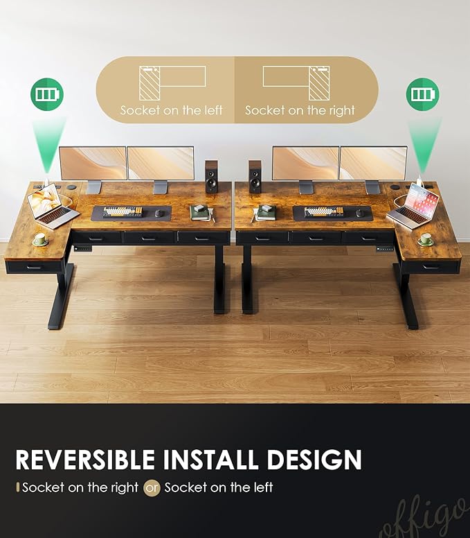 OffiGo 55 Inch L Shaped Electric Standing Desk with Drawers, Height Adjustable Large Desk with Power Outlets, Sit Stand Table, Writing Computer Desk for Home, Office, Workstation, Rustic Brown