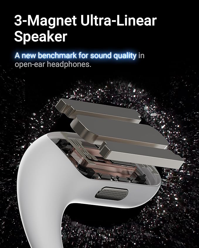 - Redefining Open-Ear Audio: Engineered by Luxshare-ICT, the 3-magnet super-linear speaker redefines open-ear audio. With up to 0.5mm high amplitude and cutting-edge diaphragm technology, it delivers powerful, deep bass, crystal-clear highs, and a rich, immersive sound experience.