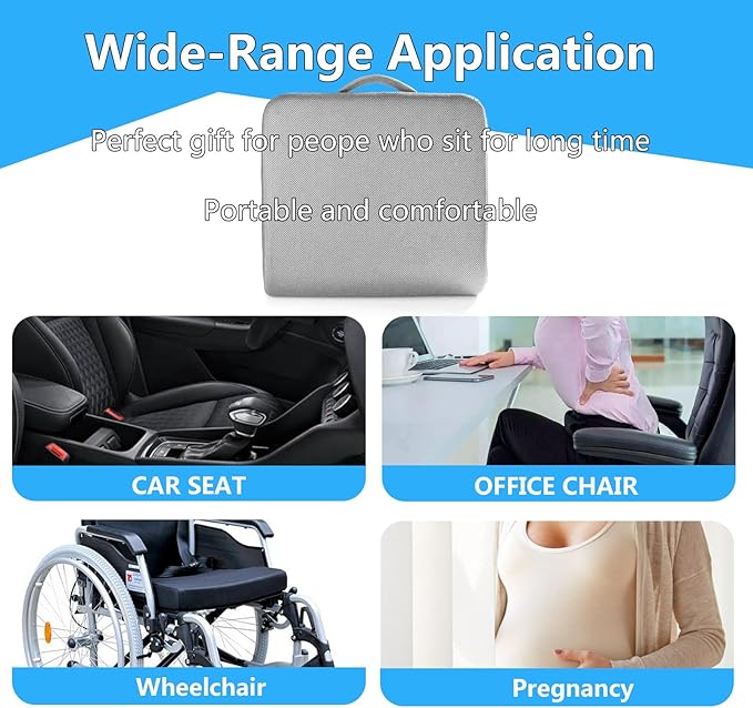 - PAIN RELIEF for Back, Legs, Hips, and Sciatica: Designed to provide comfort by alleviating pressure on the lower back, waist, hips, and thighs. Our office chair cushion also helps relieve sciatica symptoms, allowing you to power through your day. Its curve design minimizes the pressure that other chair pillows can cause to improve blood circulation.4 INCH memory foam provid adequate support and comfort,suitable for people who is overweight and need seat booster.
