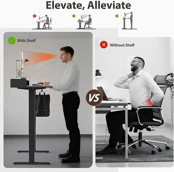 - 【Ergonomic Design】Say goodbye to sitting still all day. This desk is designed to support a healthier way to work. Stand up when your back needs a break, or adjust the shelf to lift your screen and ease neck strain. Small changes, big difference for your body.