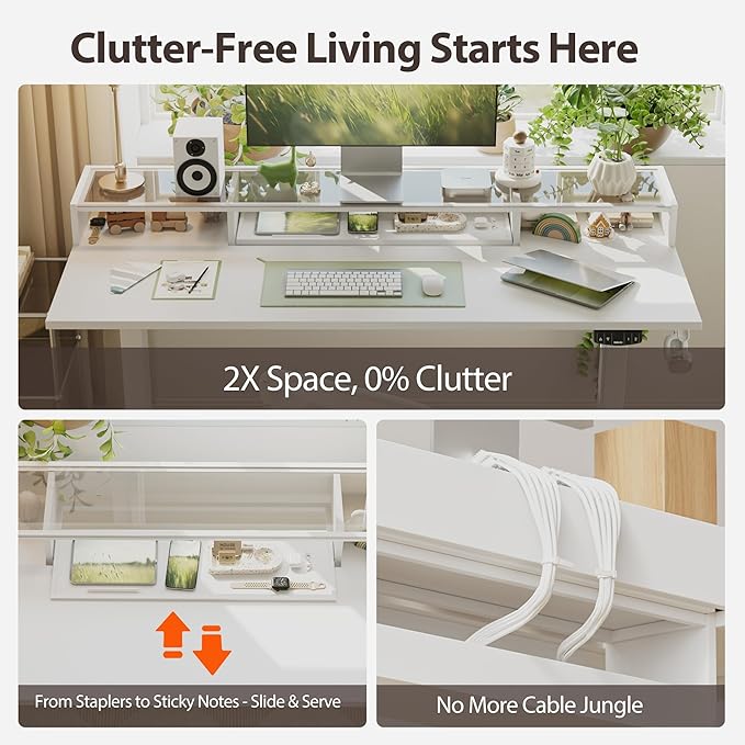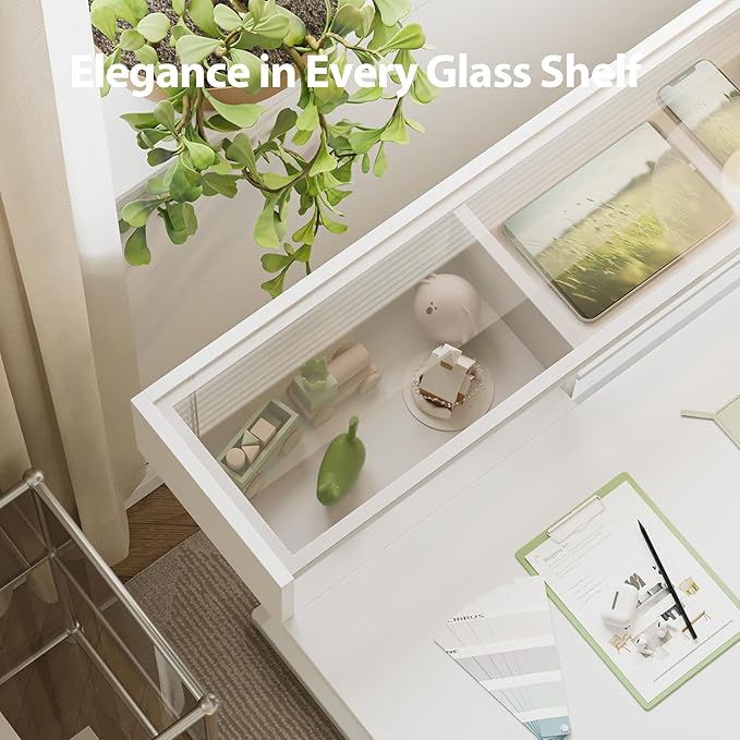 - 【Premium Glass Top Shelf】With its fluid lines and graceful form, the glass shelf transforms your workspace into a vision of modern elegance. The sleek, tempered glass surface not only exudes style but is always ready to capture every spark of inspiration with effortless ease.