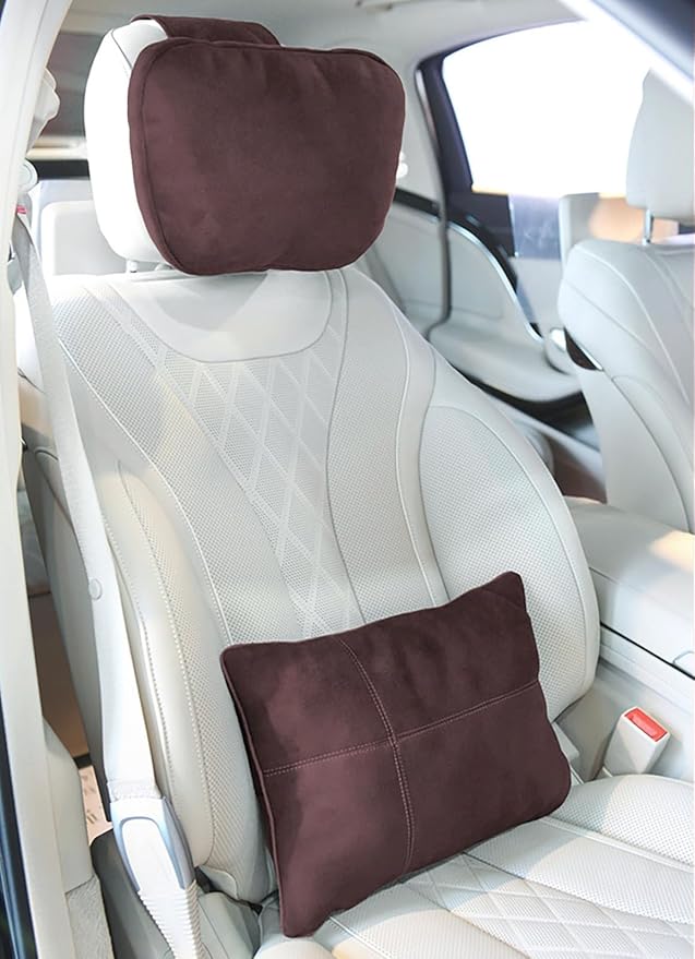 2PCS Car Pillow for Car Neck Pillow for Driving Seat Lumbar Support Soft Cushion with Extra Filling Accessories Back Support for Travel Nap and Trips Sleeping (Coffee, Head and Lumbar)