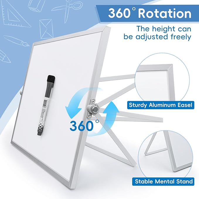 - 【Hang Or Stang】 360° adjustable knob makes small whiteboards suitable for a variety of uses. When you want to write, it could be lay down as a flat whiteboard. As a wall-mounted message board, as a to do list small dry erase board to stand on desk