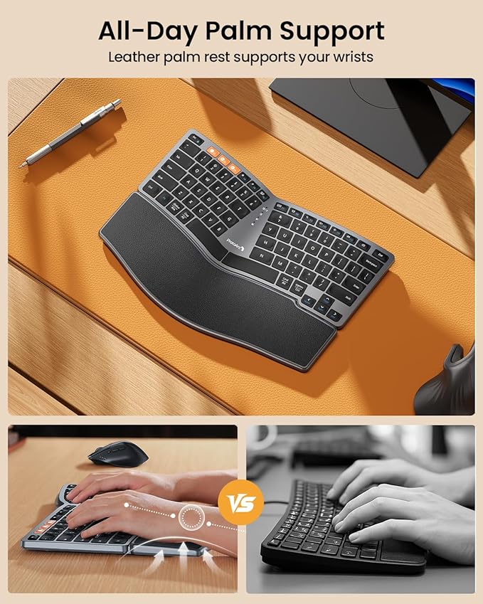 - Switch up to 3 Devices Seamlessly: The wireless ergonomic keyboard offers versatile connectivity options, via 2.4G USB receiver or Bluetooth, allowing you to easily switch between 3 devices with a simple button press. Compatible with Windows 7/8/10, Mac OS X 10.12, and Android 4.3 or higher.