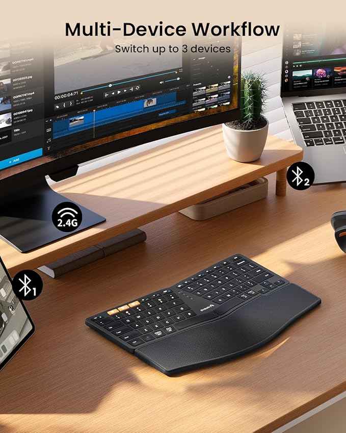 - Switch up to 3 Devices Seamlessly: The wireless ergonomic keyboard offers versatile connectivity options, via 2.4G USB receiver or Bluetooth, allowing you to easily switch between 3 devices with a simple button press. Compatible with Windows 7/8/10, Mac OS X 10.12, and Android 4.3 or higher.