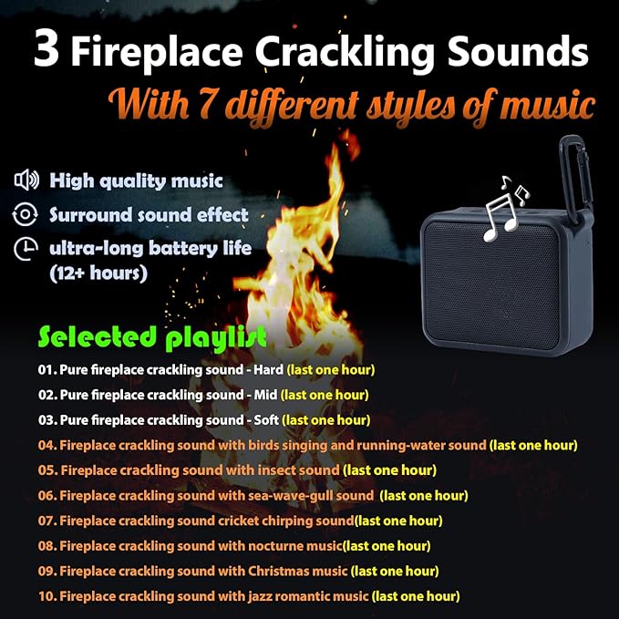 - [Rechargeable Battery] Rechargeable lithium battery provides over 12 hours of fire crackling sound at full charge,and comes with a USB cable.It charges for about 2-3 hours to reach full charge state.