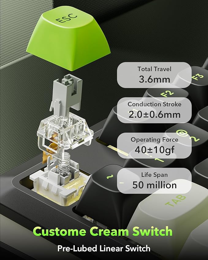 - 【Custom hick-lubed Switch】 The K734BWG features thick-lubed custom linear switches with a gasket design, offering cushioned travel and smooth typing feedback.The upgraded socket is compatible with nearly all switches (3/5 pins) for hot swappable replace.