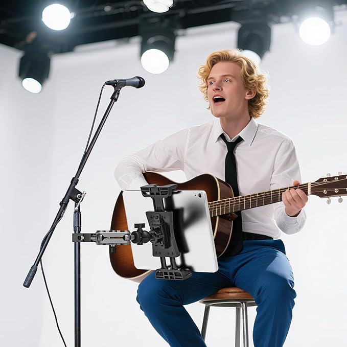 - Ultimate Viewing Freedom: The metal ball head attached to this tablet holder can be rotated 360 degrees(vertically/horizontally). And the angle of the metal arm can be adjusted 180 degrees or rotationed 360-degree by adjusting the knob. Whether you're talking on the phone while exercising, watching a video, or following a score during a stage performance, the angle can be adjusted without any tools, so you can enjoy the perfect viewing angle while exercising or performing.