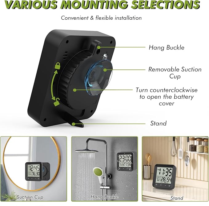 - 【MULTIPLE PLACEMENT OPTIONS】This water-resistant bathroom clock has 3 placement options - Tabletop Stand / Suction Cups/ Hanging Mount. It adapts effortlessly to any space or structure, ensuring it fits seamlessly into your lifestyle.